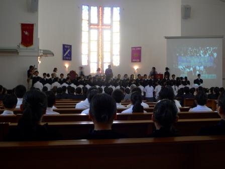 クリスチャンスクールなので、ステンドグラスがとてもキレイなチャペルが講堂になってます。