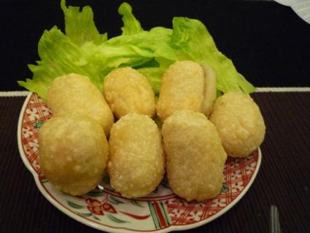 ハンスイゴゥと読みます。もち米粉などを使って皮をつくり、あんを包んで油揚げすることしばし。お店では結構値が張るお料理らしいです。